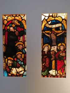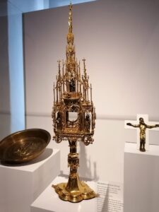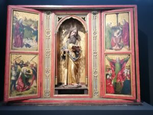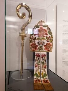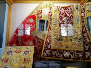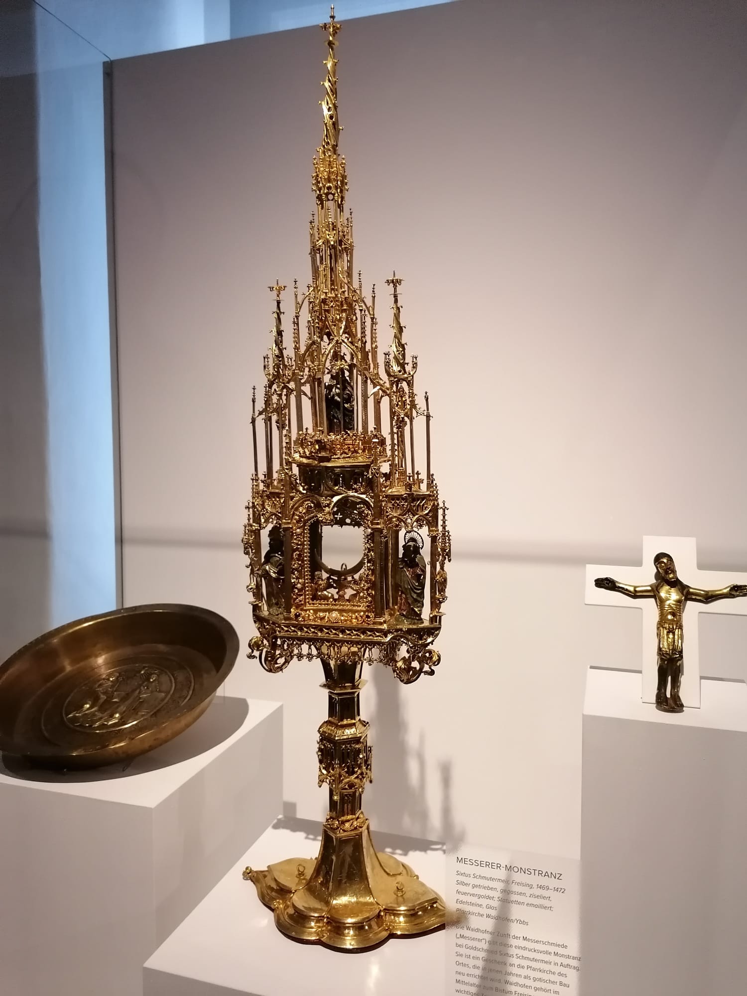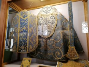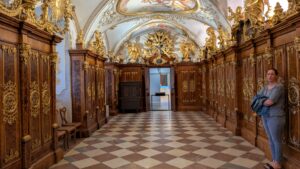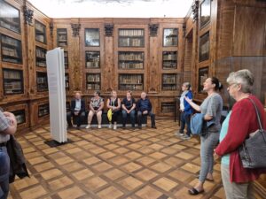 Das Museum am Dom befindet sich in den barocken Räumlichkeiten des ehemaligen Hippolyt-Klosters und beinhaltet auch die Klosterbibliothek (2 Bibliotheksräume). MMag. Barbara Taubinger, die Museumsleiterin höchstpersönlich, erzählte ambitioniert äußerst Interessantes rund um Altäre, Skulpturen, Gemälde, von der Jahresausstellung „Im Feuer geboren“, zeigte uns den Luftschutzkeller und die Schatz- und Paramentenkammer (Paramente = liturgische Textilien).