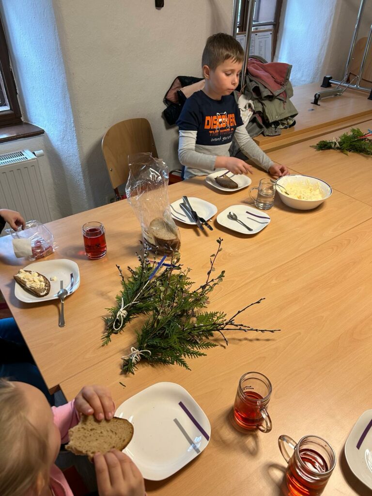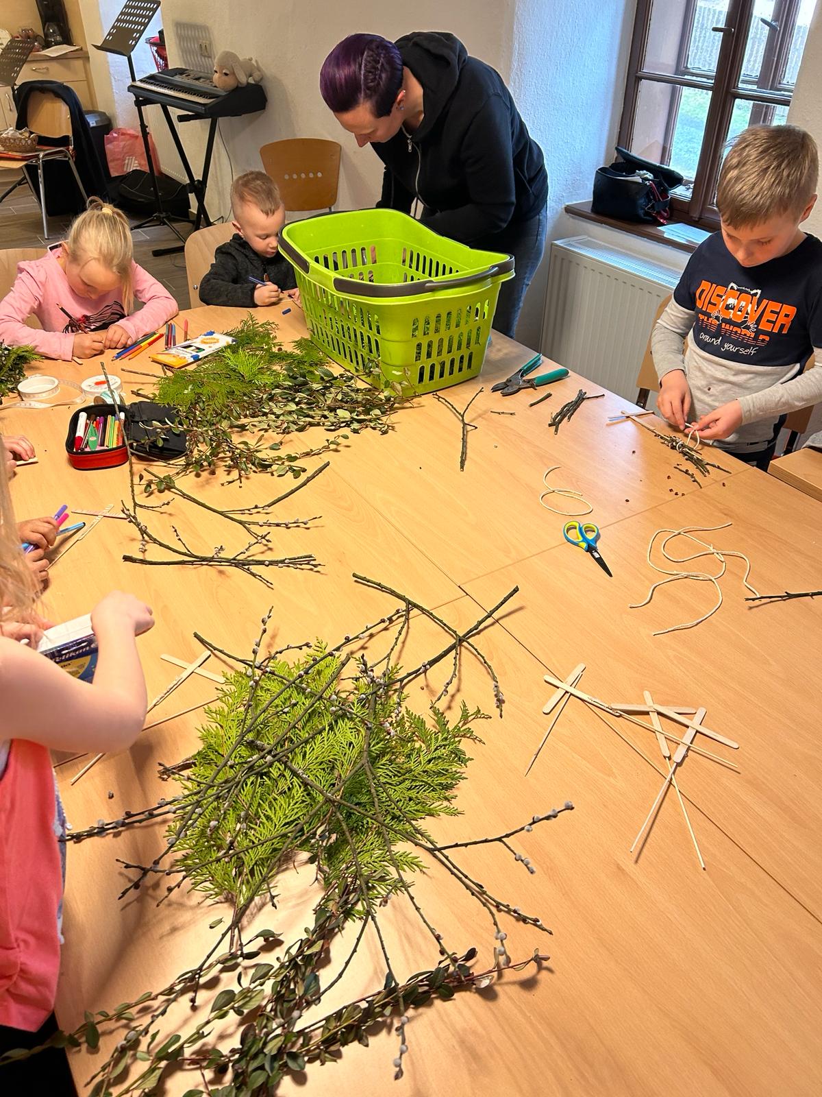 Im Zuge der Palmsonntags-WGF fand am Samstag wieder ein Kindernachmittag statt. Die Kinder sangen Lieder, hörten die Ostergeschichte, banden Palmbesen und bereiteten einen Eieraufstrich zu.