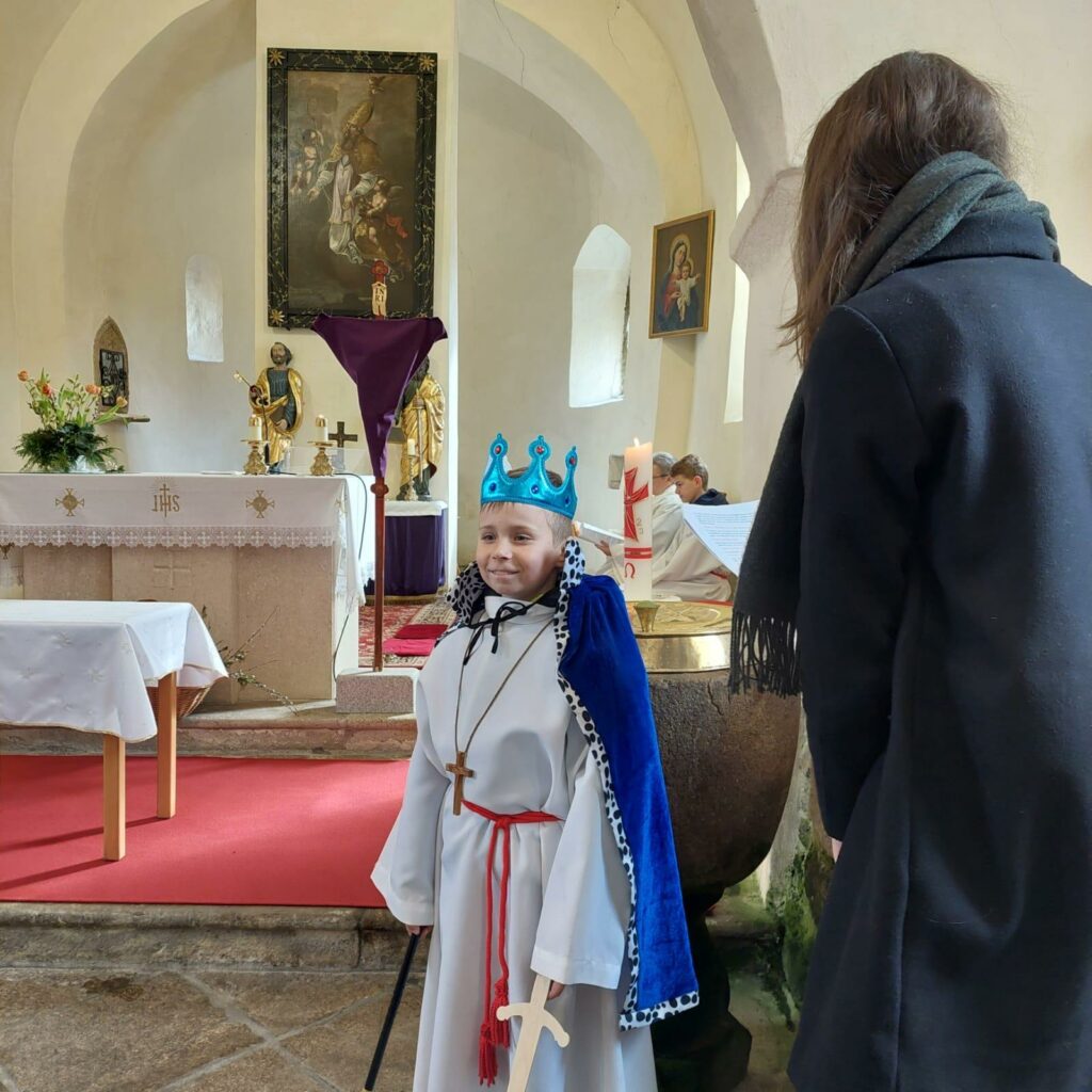 Der Ostersonntag stand wieder ganz im Zeichen der Familie und Kinder. Nach der Segnung der Palmzweige wurde uns der Unterschied zwischen einem richtigen König und Jesus erzählt. Die Kinder sangen die geübten Lieder vom Vortag und trugen Fürbitten vor. Es war wieder ein gelungenes Fest.